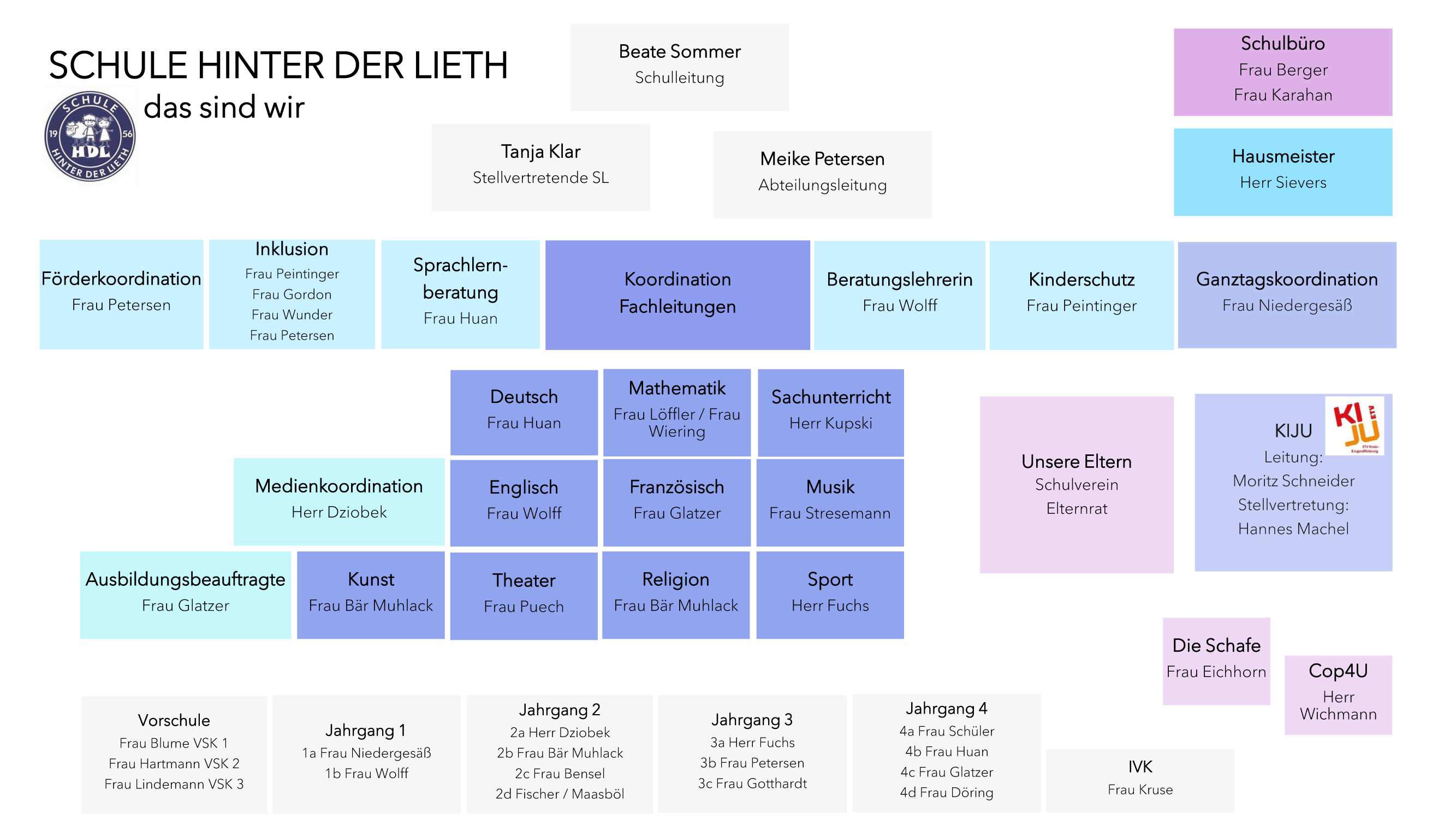 Die Funktionen unseres Kollegiums sind auf dem vergrößerbaren Organigramm sowie in der untenstehenden Liste aufgeführt.